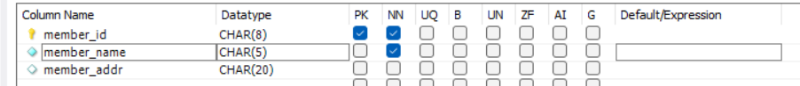 member_name은 not null yes였기 때문에 nn을 체크해주고 member_addr은 not null no였기 때문에 체크하지 않는다.
