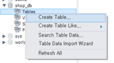 방금 만들었던 shop_db를 열면 Tables라고 있는데 마우스 오른쪽 클릭 -> Create Table 클릭