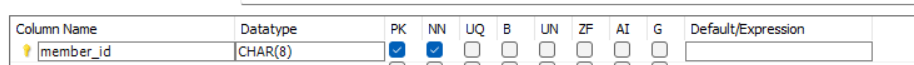우선 member_id를 먼저 만들어줬는데 Datatype은 CHAR형식의 글자수는 8개로 지정해주었다.